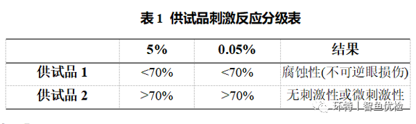 1、供试品1在5%和0.05%浓度的细胞存活率均≤70%时,则判断该受试物眼刺激强度为腐蚀性(不可逆眼损伤);供试品2在5%和0.05%浓度的细胞存活率均大于70%时,则判断该供试品眼刺激强度为无刺激性或微刺激性。