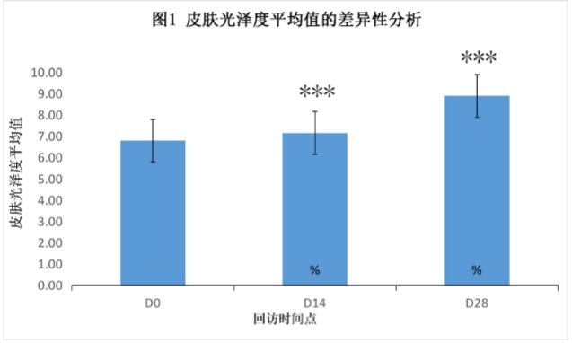 1.与基准值(D0)相比,在D14和D28回访时皮肤光泽度表现出显著性差异(P<0.001)。